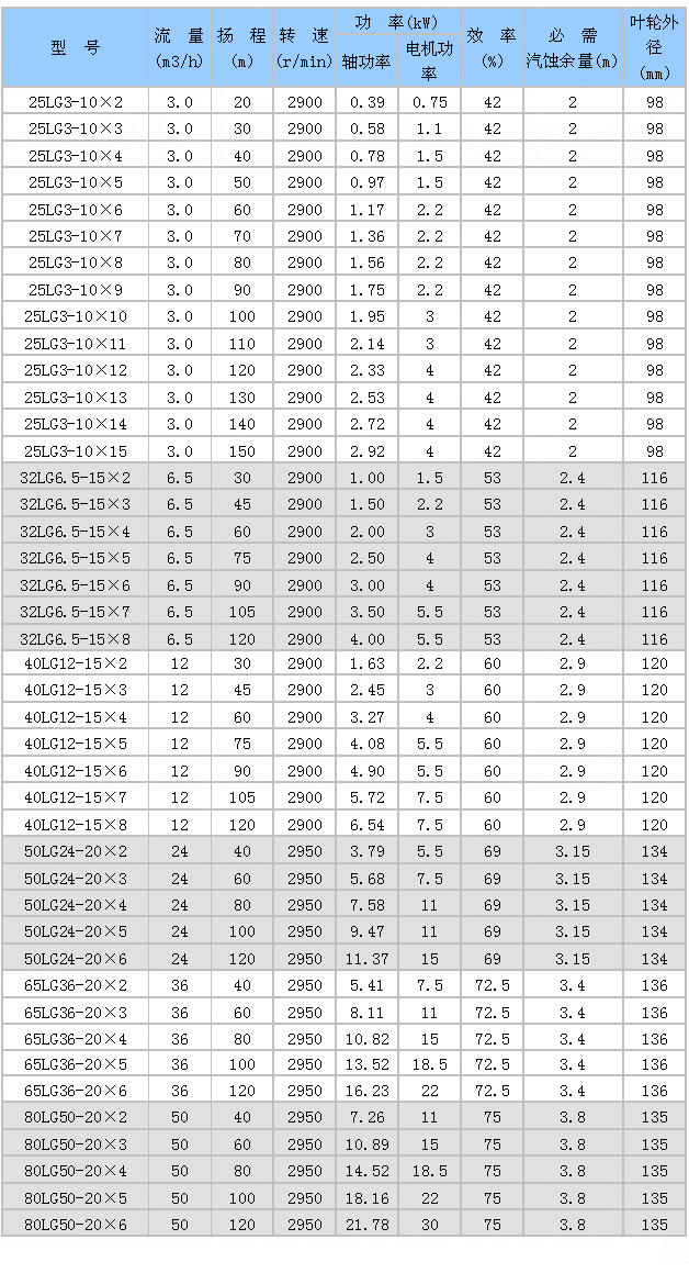 四、LG型高層建筑多級給水泵技術參數(shù):